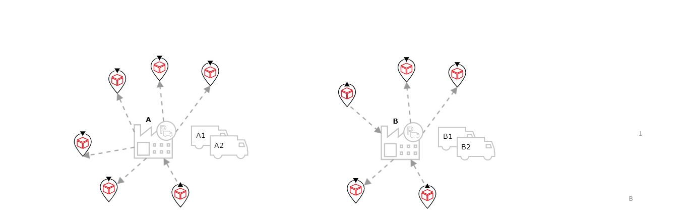 Consider following situation: There are two depot sites "Depot A" and "Depot B". Each of those depots has a fleet consisting of two vehicles and a set of pickup and delivery orders assigned to it.