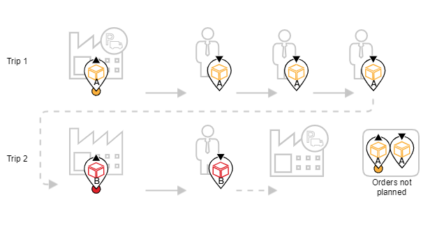 Commonly a vehicle is motorized, like a truck - including its trailer or a car. However also a bike or even a pedestrian are included in this definition. has to return to the depot after the third customer. The first trip fulfills the preference oneGroupPerTrip as all orders have the same group ID (A). The second trip does not fulfill the preference, as it contains orders of two different groups (A and B). The preference oneTripPerGroup is not fulfilled either, as both trips have orders of group A.